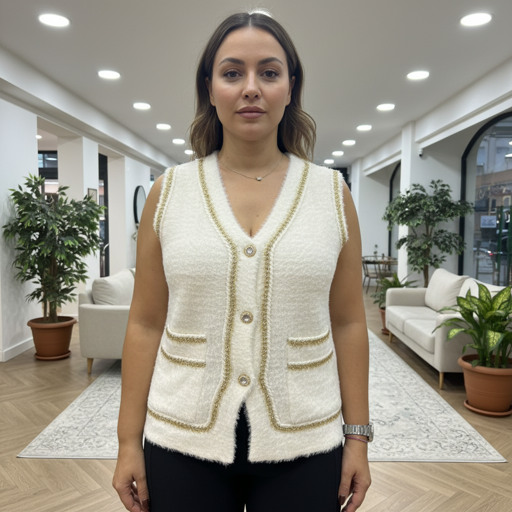 Ce gilet se distingue par ses finitions contrastées et sa matière duveteuse au toucher doux.