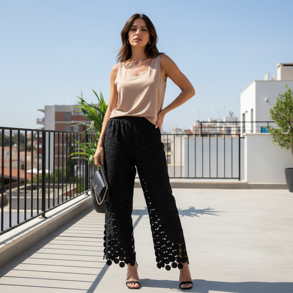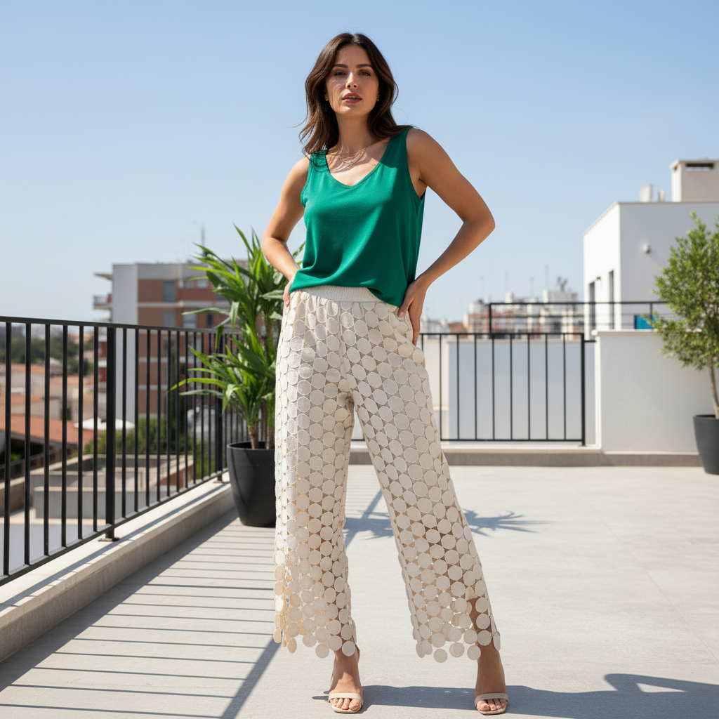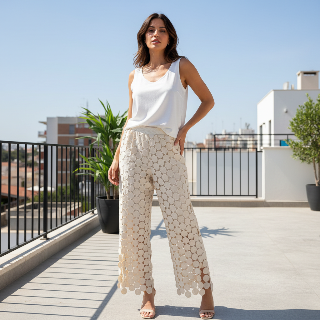 Ce pantalon ajouré est une pièce unique, moderne et pleine de caractère. Sa texture circulaire crée un jeu de transparence élégant et audacieux. Fluide et confortable, il allonge la silhouette avec légèreté. Un must-have pour un look chic et artistique signé Coinmode.ma.
